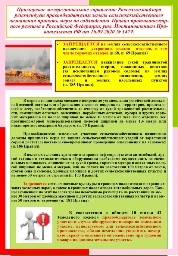 2669В целях охраны земель и предотвращения угрозы пожаров в весеннийпериод на территории Приморского края органам местного самоуправлениянеобходимо принять меры по соблюдению правообладателями земельныхучастков сельскохозяйственного назначения Правил противопожарного режимав Российской Федерации, утвержденных Постановлением ПравительстваРоссийской Федерации от 16.09.2020 № 1479, а именно: